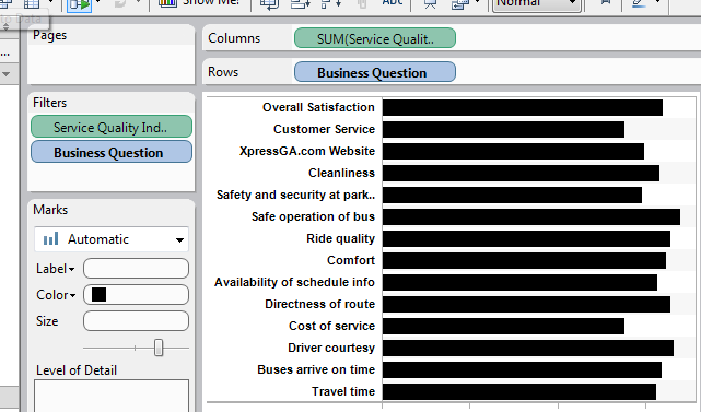 Next I changed the mark type to “Shapes” and moved the “Company” pill to the Shape Shelf.  This created an individual shape to represent each vendor.  I thought about creating custom shapes that matched the shapes in the original graph to represent each company but I decided to leave the default shapes because I thought it was easier to see through them when two or more companies share the same score on a survey question.